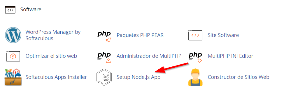 2_ Luego, en el dashboard de cPanel, accede a Setup Node.js App dentro del recuadro de Software.