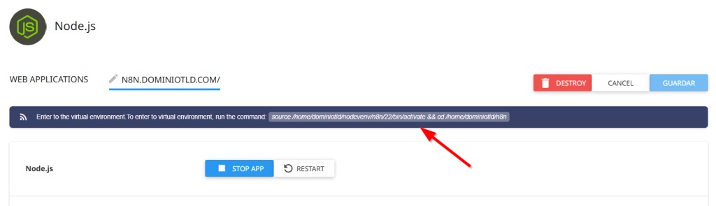 6_ Vuelve a Setup Node.js App, para editar la aplicación y copiar el siguiente comando que vas a ver en pantalla.